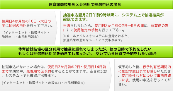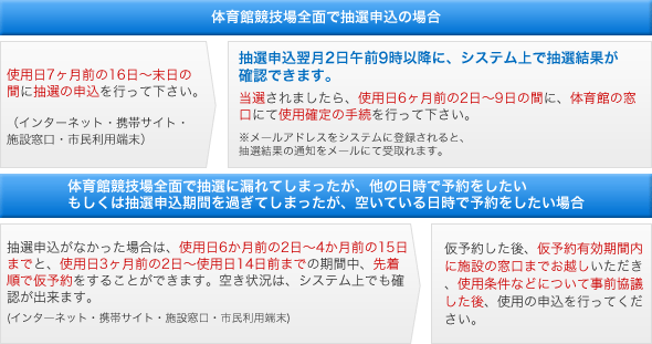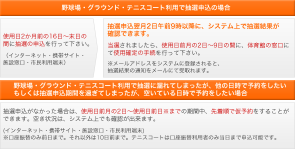 専用利用の予約及び体育館競技場・テニスコート・野球場・グラウンドの抽選予約の参加が可能。